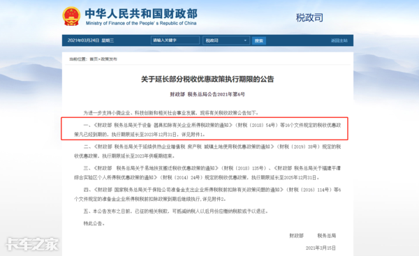 重型货车智能视频监控报警装置的招标采购工作已经在2月23日完成,据悉相关安装工作已经在3月1日起实施。● 挂车购置税减半征收 政策延长至2023年12月31日2021年3月15日,财政部、税务总局发布《关于延长部分税收优惠政策执行期限的公告》(财政部 税务总局公告2021年第6号),明确表示:半挂车购置税减半政策延长至2023年12月31日!